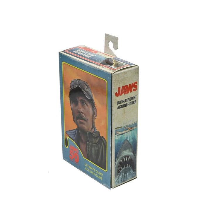 The Jaws Ultimate Sam Quint 50th Anniversary 7-Inch Scale Action Figure in collector-friendly window box packaging with opening front flap. Ages 14+.